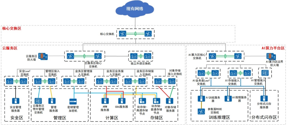 方案設計:根據(jù)需求分析結果,設計定制化的云數(shù)據(jù)中心基礎設施建設方案。涵蓋計算基礎設施、存儲基礎設施、網(wǎng)絡基礎設施、安全基礎設施、電力基礎設施、制冷基礎設施、機房設施、管理與監(jiān)控系統(tǒng)等各個子系統(tǒng)的架構設計,確保各部分協(xié)同工作,滿足用戶長期發(fā)展需求。