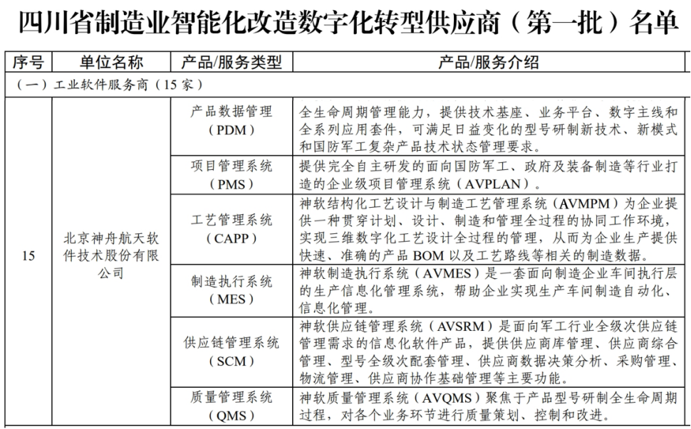 首批供應(yīng)商的遴選條件,主要包括企業(yè)營(yíng)收規(guī)模、專業(yè)資質(zhì)、屬地化服務(wù)能力、產(chǎn)品或服務(wù)領(lǐng)先性等基本條件,同時(shí)要求近三年獲得過(guò)國(guó)家級(jí)試點(diǎn)示范相關(guān)榮譽(yù),并在制造領(lǐng)域已有一批成功實(shí)踐案例。經(jīng)過(guò)企業(yè)申報(bào)、審核推薦、形式審查、意見(jiàn)征求等程序,神軟公司憑借自研的產(chǎn)品數(shù)據(jù)管理系統(tǒng)PDM,項(xiàng)目管理系統(tǒng)PMS、工藝管理系統(tǒng)CAPP、制造執(zhí)行系統(tǒng)MES、供應(yīng)鏈管理系統(tǒng)SCM、質(zhì)量管理系統(tǒng)QMS等工業(yè)軟件產(chǎn)品成功入選。