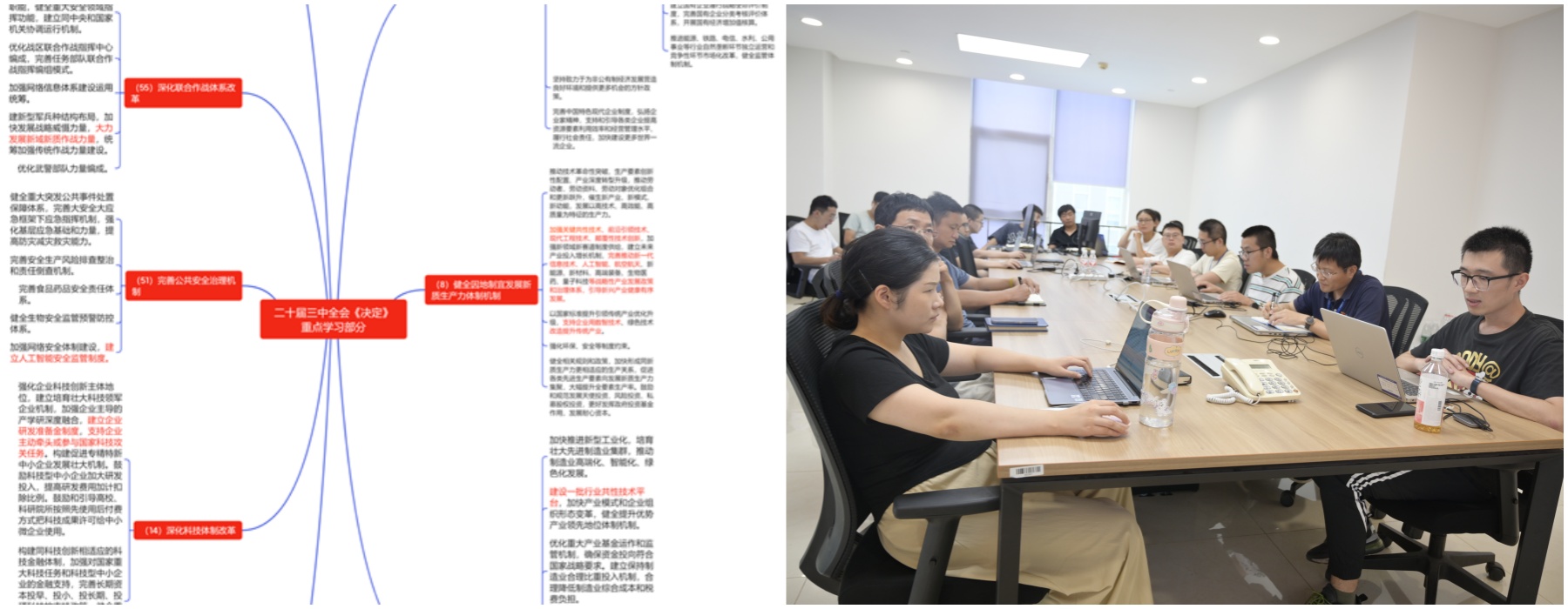 第九黨支部第一小組重點(diǎn)學(xué)習(xí)了“注重構(gòu)建支持全面創(chuàng)新體制機(jī)制”,黨員同志們紛紛表示深刻體會(huì)了堅(jiān)持守正創(chuàng)新的重要性,堅(jiān)持守正創(chuàng)新,是我們?cè)谛聲r(shí)代推進(jìn)各項(xiàng)事業(yè)發(fā)展的根本要求。在軟件研發(fā)過程中,在保證基本原則和規(guī)律的基礎(chǔ)上,要勇于探索新的技術(shù)、方法和業(yè)務(wù)模式,推出更好的產(chǎn)品服務(wù)更多的團(tuán)隊(duì),以滿足不斷變化的市場(chǎng)需求,為民族軟件的進(jìn)步貢獻(xiàn)力量。第九黨支部第二小組通過學(xué)習(xí)《黨的二十屆三中全會(huì) 一圖讀懂》,觀看《學(xué)習(xí)貫徹黨的二十屆三中全會(huì)精神系列專訪|深刻領(lǐng)會(huì)進(jìn)一步全面深化改革的主題》帶領(lǐng)黨員同志們深入學(xué)習(xí)會(huì)議精神,加強(qiáng)了對(duì)全面深化改革的理解,使黨員同志們把握會(huì)議的核心要義和實(shí)踐要求,從而在各自的工作崗位上更好地落實(shí)黨的方針政策,推動(dòng)各項(xiàng)工作的高質(zhì)量發(fā)展。