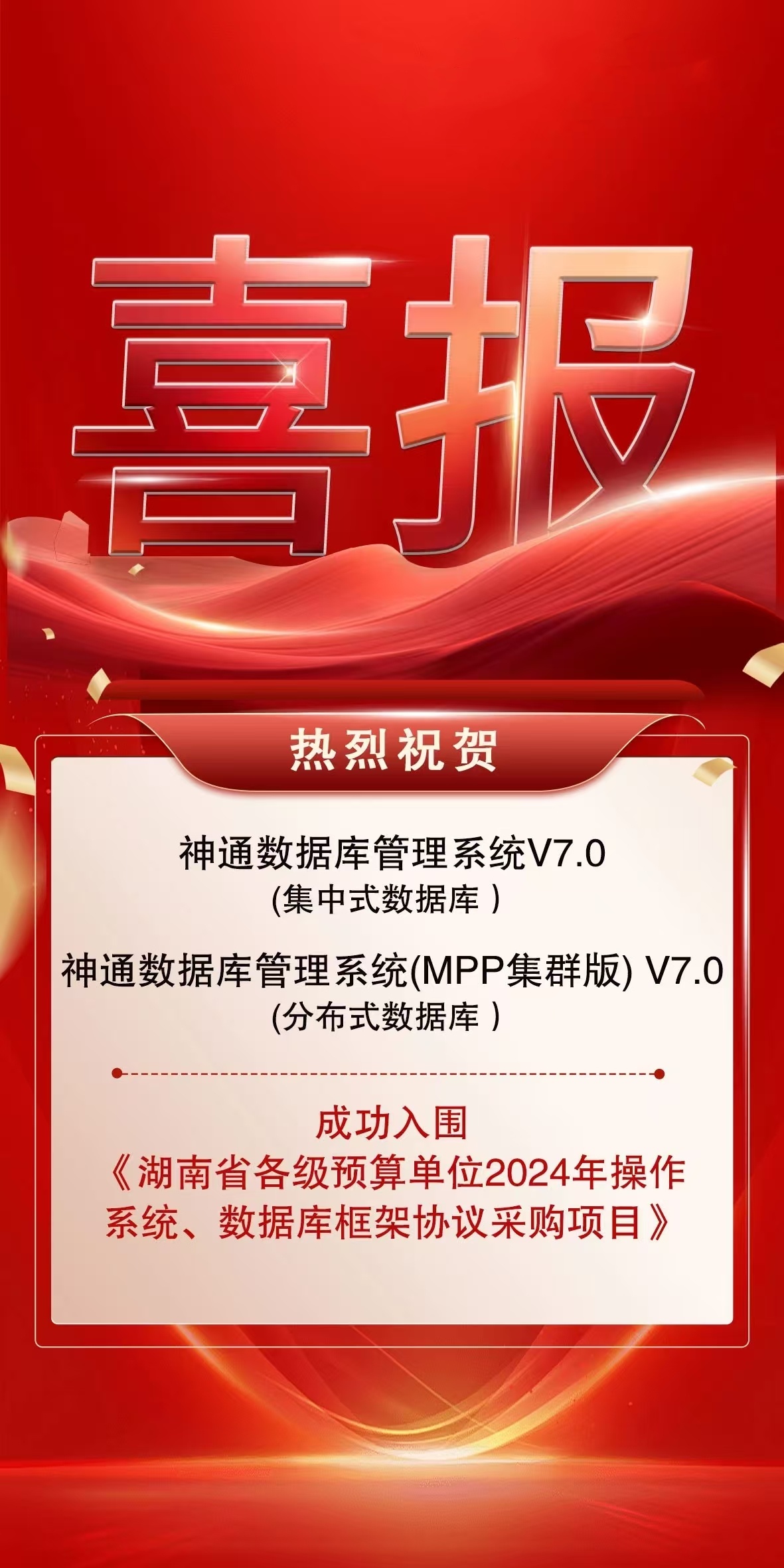 喜訊 神通數(shù)據(jù)庫入圍湖南省各級預(yù)算單位2024年操作系統(tǒng)、數(shù)據(jù)庫框架協(xié)議采購項目