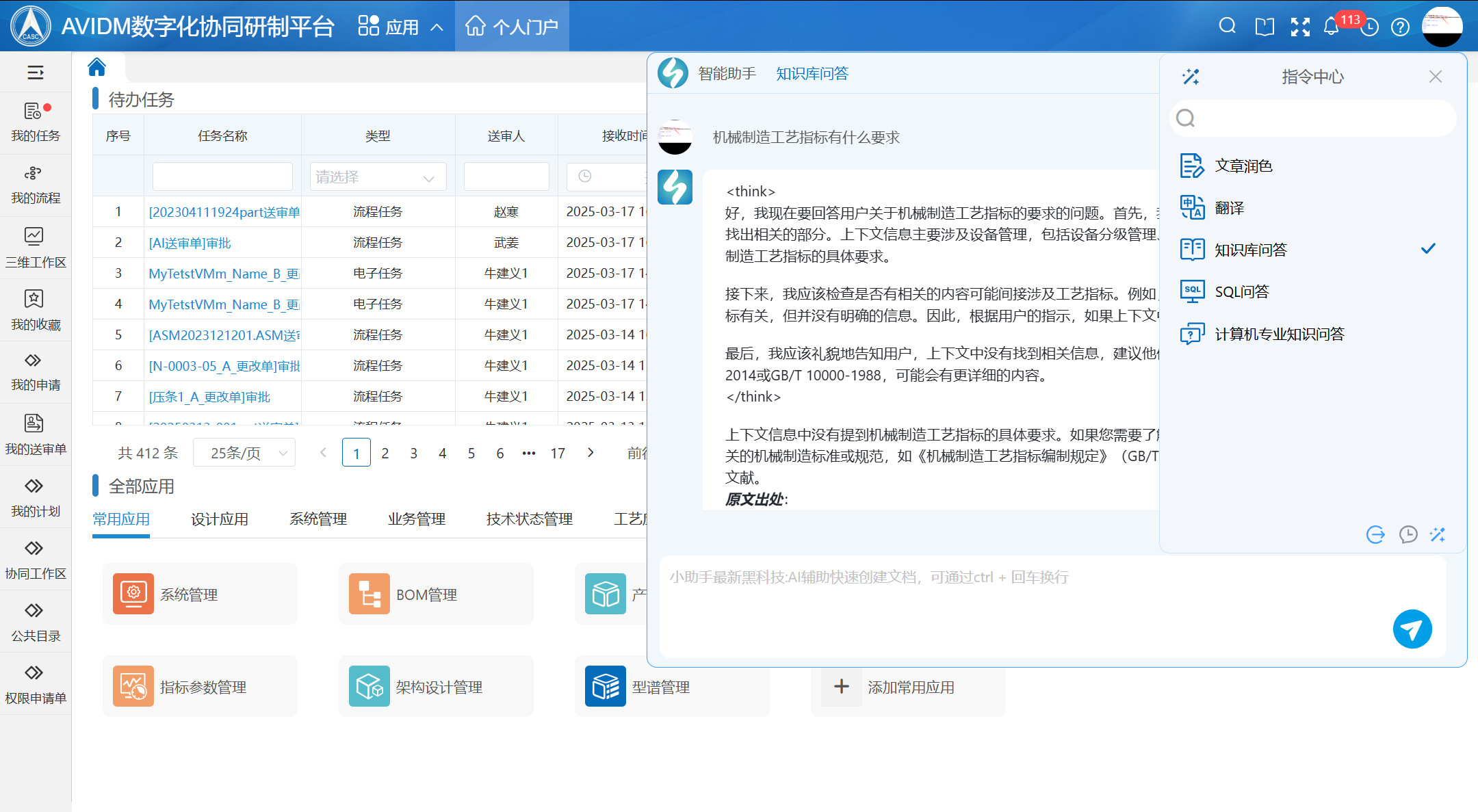 AVPLM系統(tǒng)已具備科研生產(chǎn)智能問答、文檔智能生成、文檔智能審查、工藝智能生成等智能化場景應用能力。