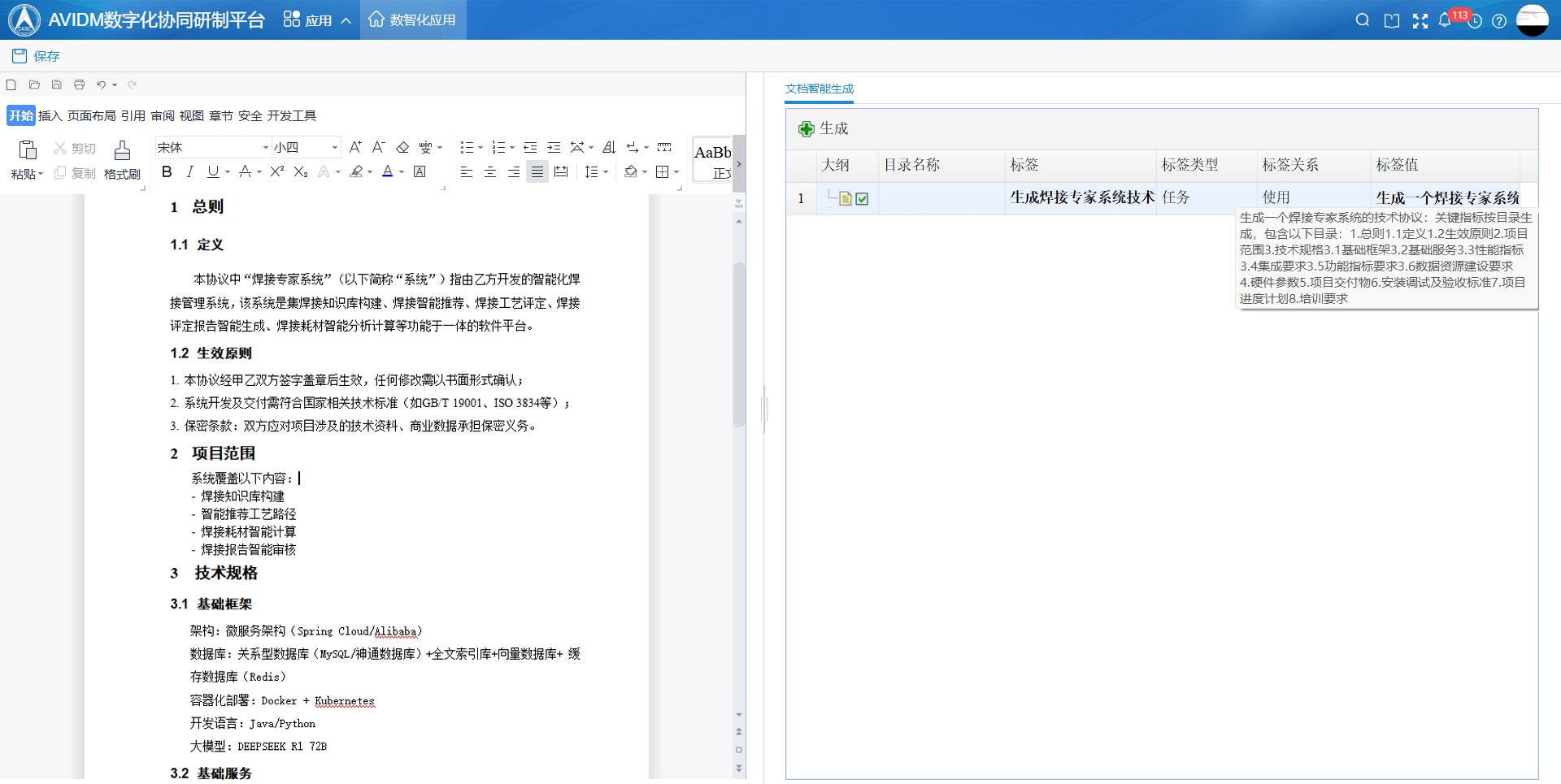 通過解析文檔模板與設計要求中的關鍵指標和關鍵詞,調(diào)用DeepSeek大模型進行語義分析,可結合科研生產(chǎn)的項目管理、體系論證、系統(tǒng)設計、工藝設計、生產(chǎn)制造、試驗驗證和運維保障業(yè)務要求,基于歷史文檔庫的相似案例匹配,一鍵生成符合規(guī)范的技術文檔。