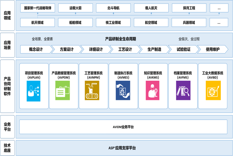 公司憑借在航天及國(guó)防軍工等復(fù)雜裝備研制信息化領(lǐng)域30余年的積累和實(shí)踐,形成了以AVIDM為品牌的核心工業(yè)軟件產(chǎn)品體系。AVIDM系列軟件主要包括項(xiàng)目管理系統(tǒng) (AVPLAN)、產(chǎn)品數(shù)據(jù)管理系統(tǒng)(AVPDM)、工藝管理系統(tǒng)(AVMPM)、制造執(zhí)行系統(tǒng)(AVMES)、知識(shí)管理系統(tǒng)(AVKMS)、數(shù)字檔案管理系統(tǒng)(AVFMS)和工業(yè)大數(shù)據(jù)系統(tǒng)(AVIBD)等子產(chǎn)品。